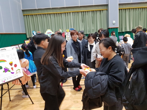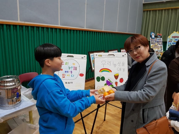 | 아천초등학교(교장 이용옥)는, 11월 29일(금) 솔마루 강당에서 열린 아천 갈무리 한마당에 참석한 학부모 및 학생들을 대상으로 우리 쌀로 만든 떡과 김천시장에서 구입한 귤을 나눠주며 우리 농산물 이용에 동참하도록 캠페인을 펼쳤다.