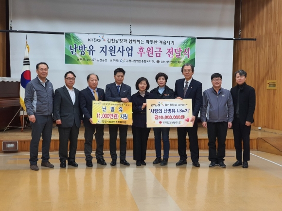 | 김천시지역사회보장협의체(위원장 김충섭, 공동위원장 배수향)와 KT&G 김천공장(공장장 민웅기)은 KT&G김천공장과 김천시지역사회보장협의체가 함께하는 「사랑의 난방유 지원사업」을 위해 지난 4일(수) 김천시장애인종합복지관에서 사업 후원금 2,000만원을 전달하였다.