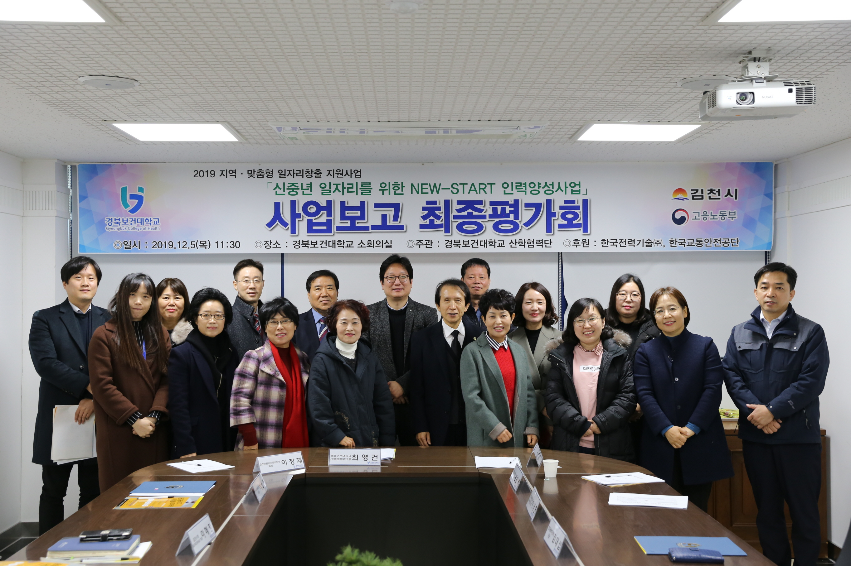 | 김천시와 경북보건대학교(총장 이은직) 산학협력단은 고용노동부가 주관하고 한국전력기술(주)과 한국교통안전공단이 후원하는 ‘2019 신중년 일자리를 위한 NEW-START 인력양성사업’ 사업보고 최종평가회를 5일(목) 11:30, 대학본부 2층 소회의실에서 개최했다.