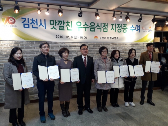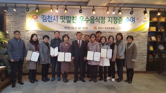 | 김천시(시장 김충섭)는 지난 12월 6일 대항면 직지상가 금오식당에서 김천의 맛과 멋을 담고 있으면서 “Happy together 김천운동”을 실천하는 2019년 하반기 “김천시 맛·깔·친(맛있고 깔끔하고 친절한 업소) 우수음식점” 8개소를 선정하여 지정증 수여식을 하였다.