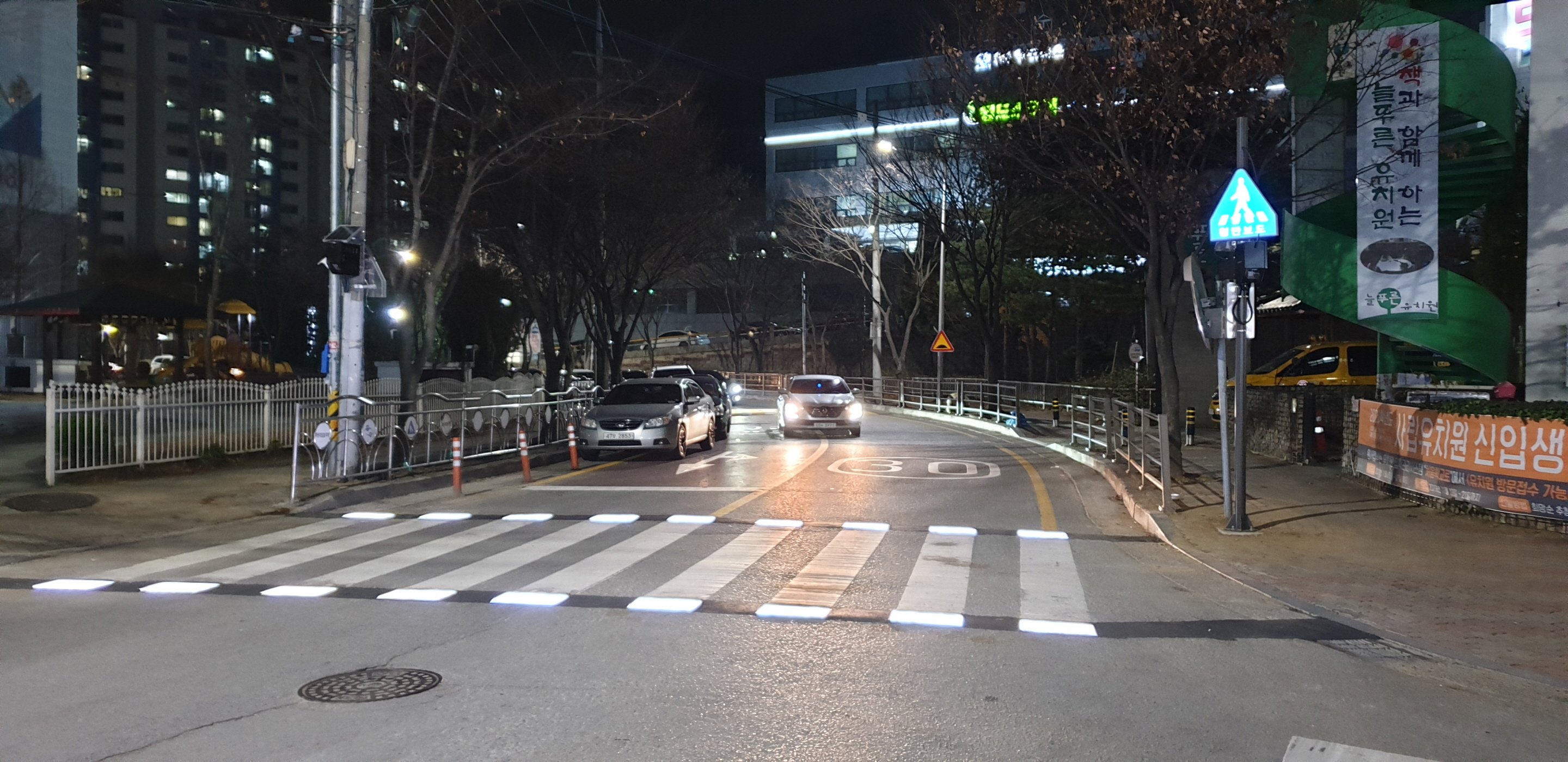 | 경상북도는 야간보행 및 악천후 시 학교주변 등에서 도로횡단 중에 발생하는 교통사고 예방을 위해 최근 경북 구미 옥계 신나리 2차 아파트 주변 옥계초등학교 어린이보호구역 내 신호등이 없는 횡단보도 1개소에‘지능형 횡단보도용 교통안전 시스템’을 시범설치 했다고 밝혔다.