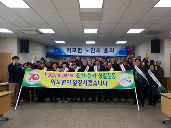 전정호 노인회장은 추운 날씨에도 불구하고 참석해주신 경로당 회장, 총무에게 감사드리며, “우리 노인들이 그동안 쌓아 온 경험과 식견을 바탕으로 적극적으로 면 행정에 협조하고 해피투게더 운동을 실천하여, 모든 이웃들이 행복하고 건강한 어모면이 될 수 있도록 선도해 나가자”며 결의를 다졌다.