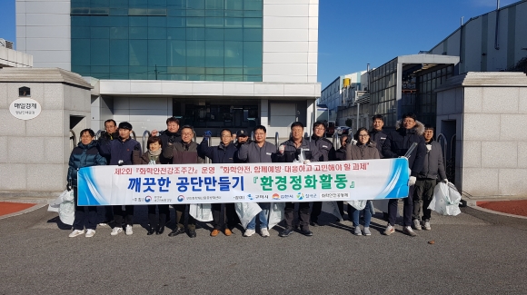 | 대구지방환경청(청장: 정경윤)과 구미화학재난합동방재센터는 구미산업단지, 김천산업단지, 칠곡왜관산업단지에서 제2회 화학안전강조주간 중 마지막 일정으로 “깨끗한 공단만들기 환경정화활동”을 12월 6일에 실시했다.