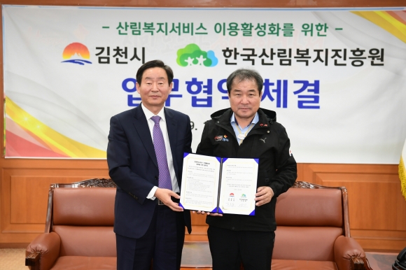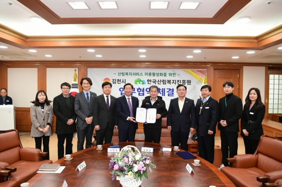 | 김천시(시장 김충섭)는 12월 9일 산림청 한국산림복지진흥원(원장 이창재)과 김천시청 접견실에서 산림복지서비스를 확대・발전시키기 위한 업무협약을 체결했다고 밝혔다.
