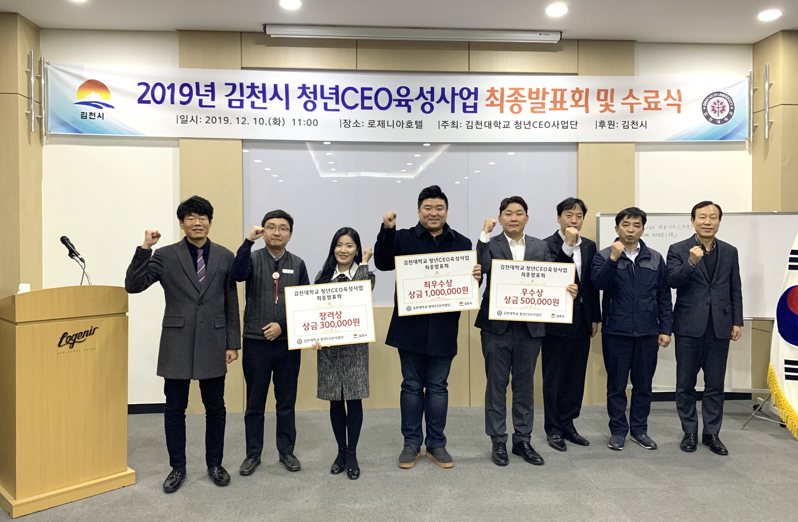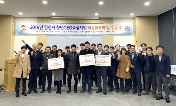 | 김천대학교(윤옥현 총장)는 “2019년 청년CEO육성사업 최종발표회 및 수료식 ”을 개최하였다. 이번 행사에서 청년CEO 최우수상(100만원)은 김국용 대표(질병 확산방지를 위한 열화상 CCTV), 우수상(50만원) 박일성 대표 (백두대간 농산: 김천 호두 브랜드화), 장려상(30만원) 이슬 대표(김천 지역의 스토리에 기반한 공연예술 작품 창작 및 공연, 공연예술 교육 활동)가 수상하였다.