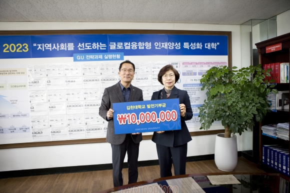 청운테크 권영오 대표는 발전기금을 전달하면서 “오랫동안 삼성전자 구미캠퍼스 동호회 중창단을 지도해 온 김천대 공연예술학부의 이태원 교수와의 인연으로 본 대학에 기부를 결심하였으며, 기부금은 지역사회를 이끌고 국가발전에 기여하는 바른 인재양성에 도움이 되기를 바란다.”라고 말했고, 윤옥현 총장은 “대학발전에 도움을 주신 청운테크 권영오대표에게 감사드리며, 지역사회는 물론 국가발전에 기여하는 인재양성에 소중히 사용하겠다.”라고 밝혔다. |
