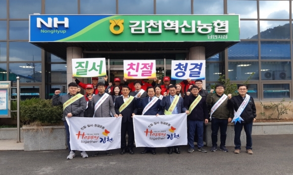 | 네 번째는 김천 혁신농협 (조합장 이성희)에서 남면지점 전 직원이 함께하여 릴레이 캠페인에 동참 한다는 결의대회를 갖고 인근 공원과 하천에서 국토 대청결운동 과제를 실천하였다. 다섯 번째는 겨울철 화재예방에 최선을 다하고 있는 남면 의용소방대(대장 박성수)에서는 『Happy together 김천 운동』생활 속 실천을 위해 적극 노력하겠다면서 빈집을 돌며 스티로폴 등 화기위험성이 높은 물건을 수거 처리하는 자연정화 활동을 전개하였다.