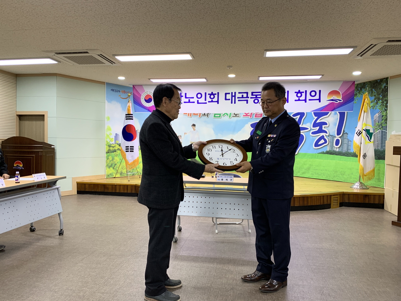 이날 회의에서는 새마을교통봉사대 김천지대(총무 박태규)는 어르신들의 교통 사고 예방을 위한 교육을 진행하였으며, 이어서 참석한 경로당 회장들에게 벽걸이 시계를 전달하는 시간을 가졌다.