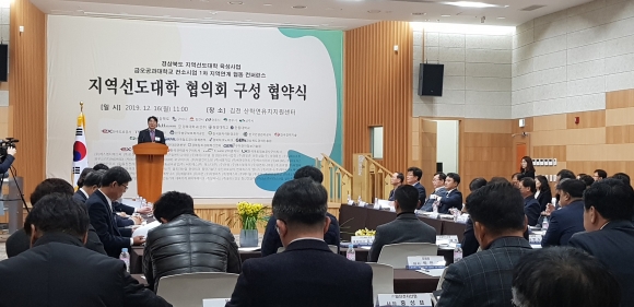 | 경상북도 16일 김천 산학연유치지원센터에서 사업 참여기관 관계자 100여명이 참석한 가운데 지역선도대학 금오공대 컨소시엄 기관 간 협약식을 개최했다.