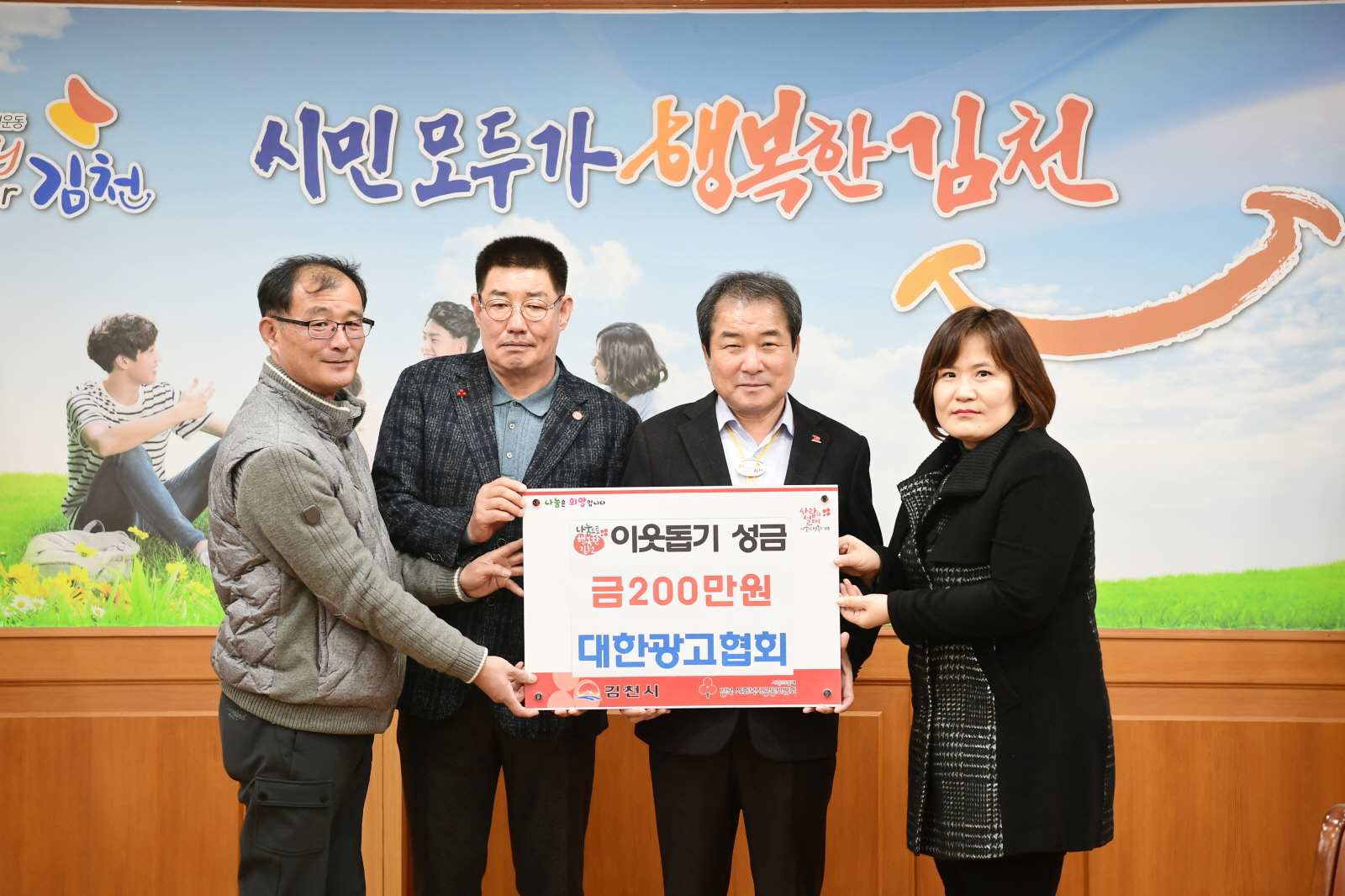 김천시 대한광고협회는 주위의 불우한 이웃을 위해 “해피투게더 김천”실천운동과 함께 성금을 전달하였으며, 성금은 우리시 어려운 이웃들에게 따뜻한 마음을 담아 전달될 예정이다.
