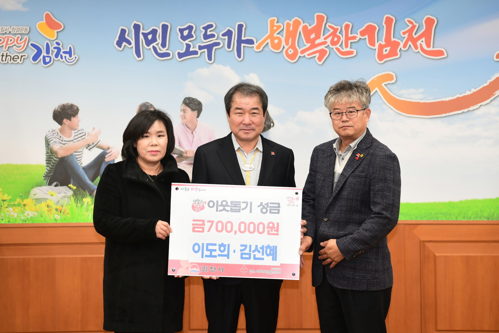 | 김천시 대곡동새마을협의회장 이도희, 김천시새마을여성합창단장 김선혜 부부는 지난 20일 김천시청을 방문해 이웃돕기 성금 70만원을 전달했다.