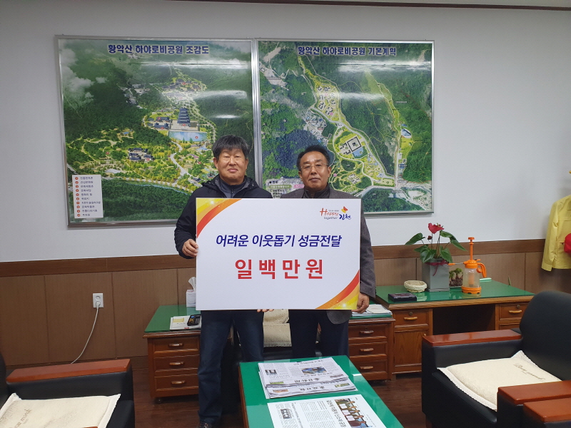 | 김천시 대항면 구명철 (대항면 운수1리 이장)은 대항면사무소를 방문하여 어려운 이웃에게 써달라며 100만원의 불우이웃돕기 성금을 기부하였다.