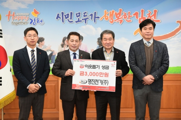 김충섭 김천시장은 “불경기에도 불구하고 귀한 마음을 써주신 명진전기(주)에 깊은 감사를 드린다. 전해 주신 성금은 꼭 필요한 곳에 전달해 우리 지역의 소외이웃들이 따뜻한 겨울을 나는데 도움이 되도록 잘 전달하겠다. 행정에서도 시민 모두가 행복한 김천, 희망이 넘치는 김천시가 될 수 있도록 노력할 것.”이라고 말했다.