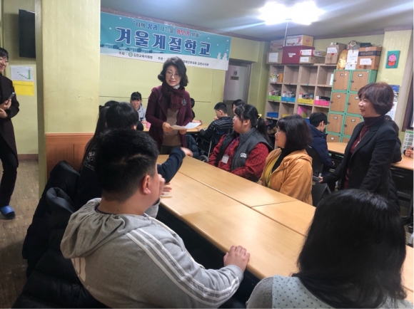 | 경상북도김천교육지원청(교육장 마숙자)은 1월 6일(월)부터 17일(금)까지 겨울 계절학교를 운영한다. 겨울 계절학교는 중·고등학교 특수교육대상학생 중 희망하는 학생들이 참여하며, 경상북도장애인부모회 김천시지부와 협조하여 위탁 운영한다.