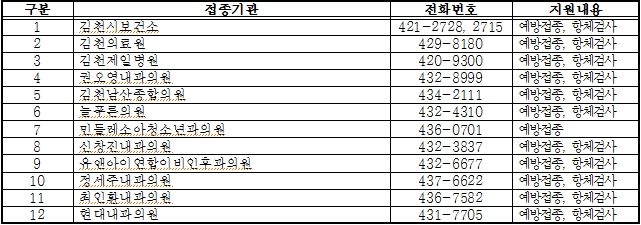 고위험군 대상자는 김천시보건소 또는 관내 지정 의료기관을 방문하면 예방접종과 항체검사를 무료로 받을 수 있다. 대상자별 예방접종 시행 시기와 항체검사가능 여부가 다를 수 있으므로, 방문 전 해당 기관에 반드시 문의하고 방문하시길 바란다.
