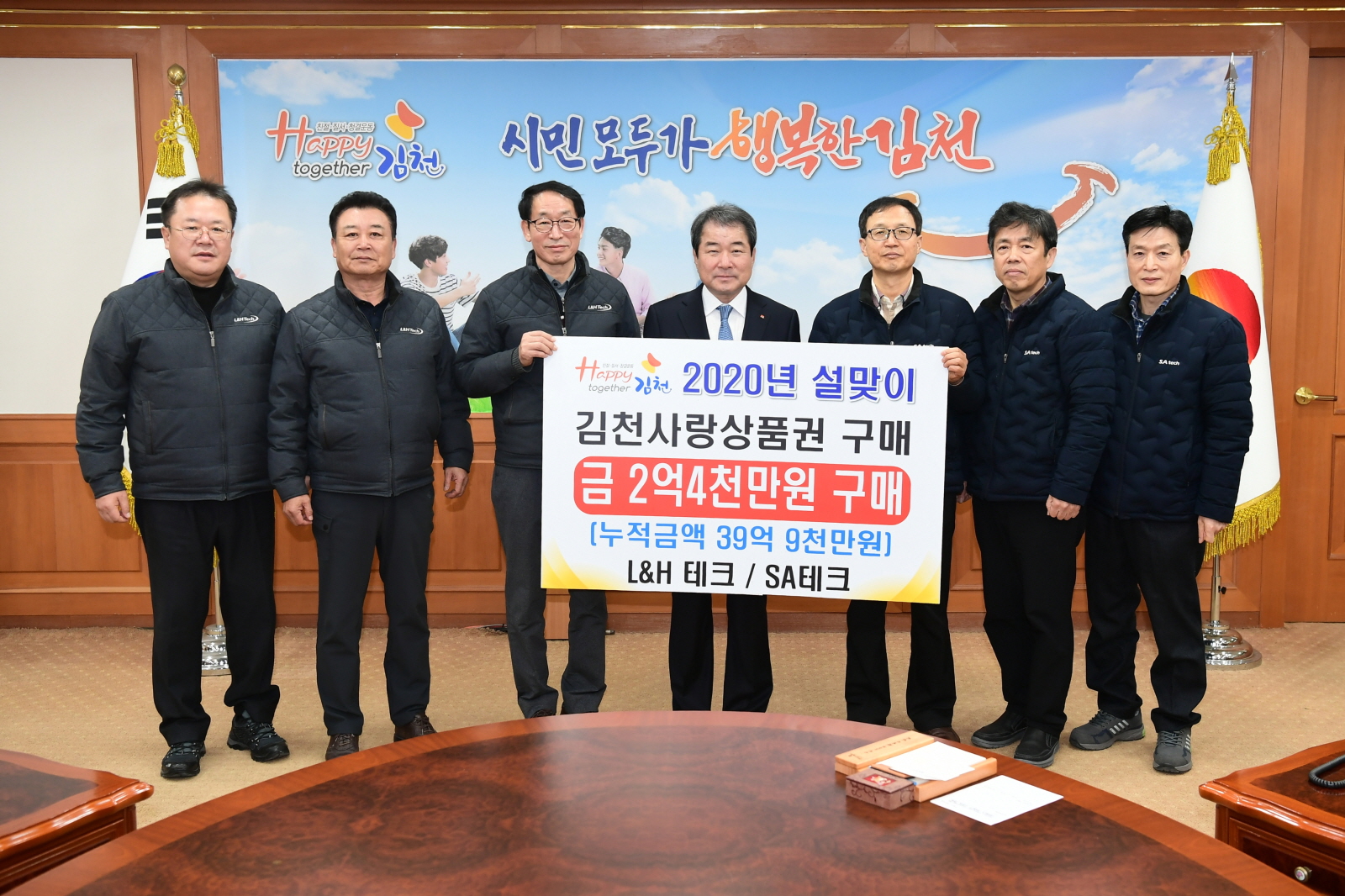 | 2020년 설 명절을 맞이하여 (주)앨엔에이치테크(L&H테크)와 (주)에스에이테크(SA테크)가 지역경제 활성화 및 지역 소상공인과 상생협력을 위해 1. 17.(금) 김천사랑 상품권 2억 4천만원을 구매하였다.