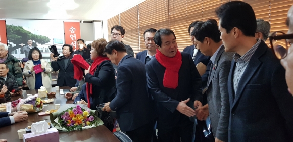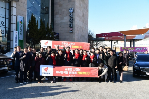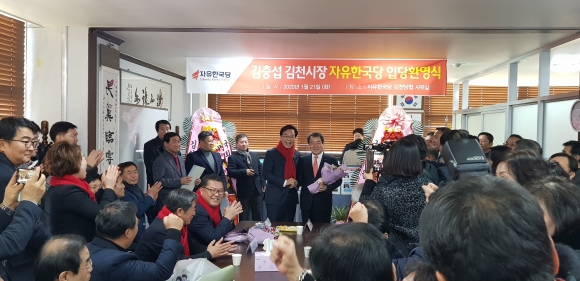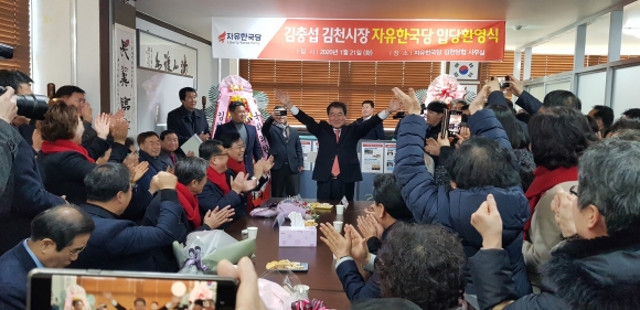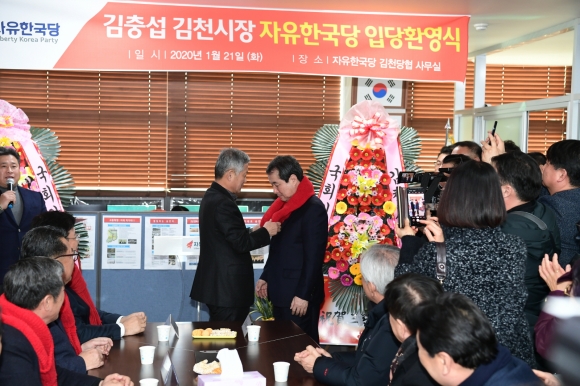 | 김충섭 김천시장은 1월 21일(화) 15:00, 자유한국당 김천시당 사무실에서 송언석 국회의원과 당원들이 참석한 가운데 자유한국당 입당식 및 환영회를 가졌다. 이로써 김천시정 방침인 “전국에서 가장 살기 좋은도시”, “시민모두가 행복한 도시”건설이 앞으로 한층 더 탄력을 받게 될 전망이다.