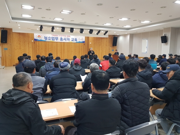 이번 교육은 쓰레기 없는 쾌적한 도시, 깨끗한 시민생활 환경 조성을 위해 애쓰고 있는 환경미화원들을 대상으로 실시하는 정기교육으로, 작업 특성상 사고 위험의 노출이 많은 환경미화원들의 안전사고를 예방교육을 중점적으로 실시하였다.