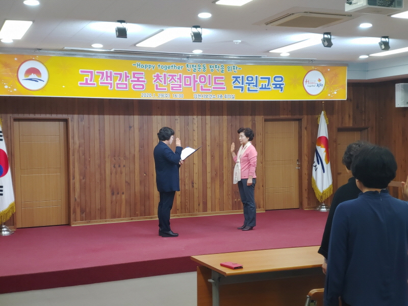 이번 교육은 Happy together 김천운동을 정착시키기 위하여 직원을 대상으로 추진하였는데 교육 전에 힐링 건강체조를 실시하고 ▲친절서비스 제공하기 ▲먼저 인사하고 고운말 쓰기 ▲임산부와 노약자를 배려하고 예절지키기 ▲사무실 청결하게 관리하기 등 고객감동 친절서비스 실천 결의를 다지는 선서도 하였다.