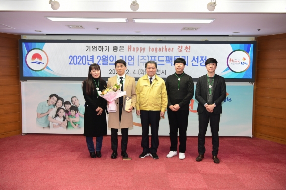 | 김천시(시장 김충섭)는 2월 이달의 기업으로 농업회사법인 주식회사 푸드팩토리를 선정하여 2월 4일 ㈜푸드팩토리 김경민 대표와 임직원 등 20여명이 참석한 가운데 선정패 수여식 및 회사기 게양식을 개최하였다. 지역경제 기반의 중추적인 역할을 담당하고 있는 중소기업의 사기를 진작하고 자긍심 고취 및 일자리 창출을 통한 지역경제 활성화를 위해 2019년 2월부터 시작해 현재까지 매월 1개 기업을 이달의 기업으로 선정하고 있다.