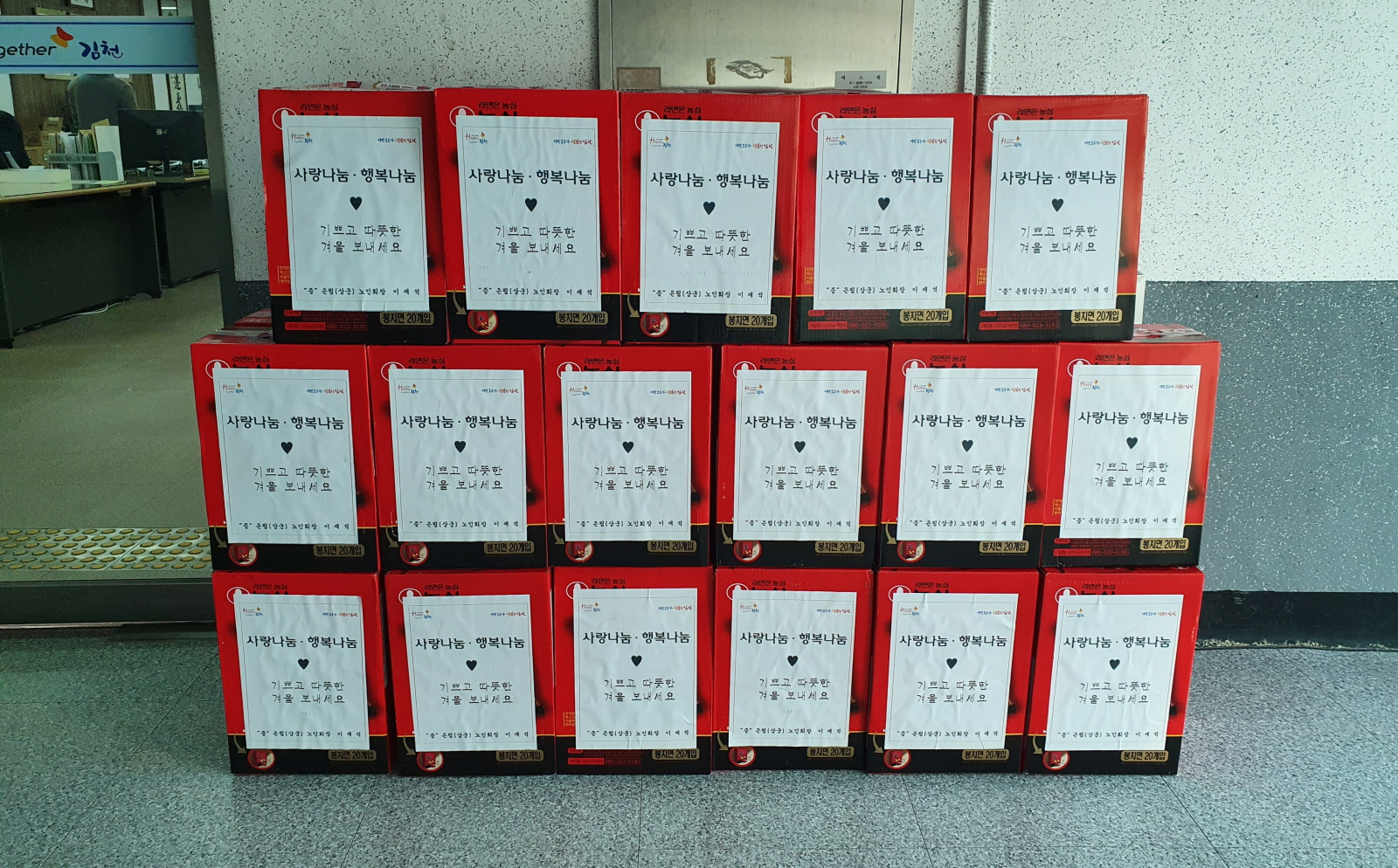 | 감문면 은림(상군)경로당 노인회장 이재석은 지난 7일(금), 「Happy Together, 김천」운동의 일환으로 시민 모두가 행복한 김천 만들기에 동참하고자 이웃돕기 라면 36여 박스를 면사무소에 전달했다.