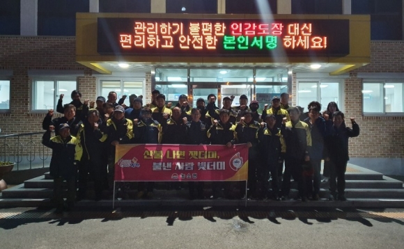의용소방대장 박계은 외 27명으로 구성된 의용소방대는 직원 및 산불감시원들과 함께 일몰시부터 저녁 9시까지 사찰, 암자, 독가촌 및 산불취약지 위주로 야간순찰활동을 펼치는 동시에 산림 인접지 내 농산부산물 등 인화물질을 제거하였다.