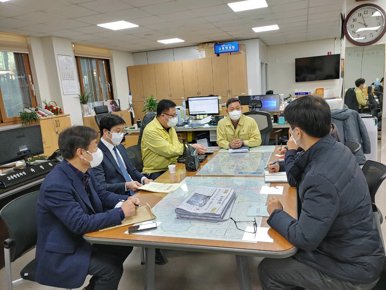 대책회의에는 김천버스(주), 4개 일반법인택시 및 개인택시 김천시지부, 행복콜 담당자가 참석하여 코로나21 확산에 대응하고자 회의를 가졌다. 그동안 김천시에서는 소독방역약품, 마스크, 손세정제를 배부하였고, 방역일지를 배부, 작성하여 경각심 및 책임감을 가지도록 하였다.