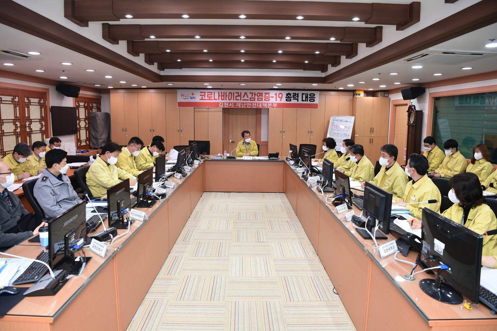 | 김천시(시장 김충섭)는 최근 코로나-19 심각단계 격상에 따라 김천시 재난안전대책본부 운영을 24시간 비상근무 체제로 실시하고 확산 방지를 위한 비상사태에 들어갔다. 또한 매일 재난종합상황실에서 대책회의를 개최하여 그 간 추진상황을 점검하고 향후 계획을 검토하는 등 발빠른 대처로 시민들의 건강과 안전에 대한 불안감을 해소시키기 위함이다.