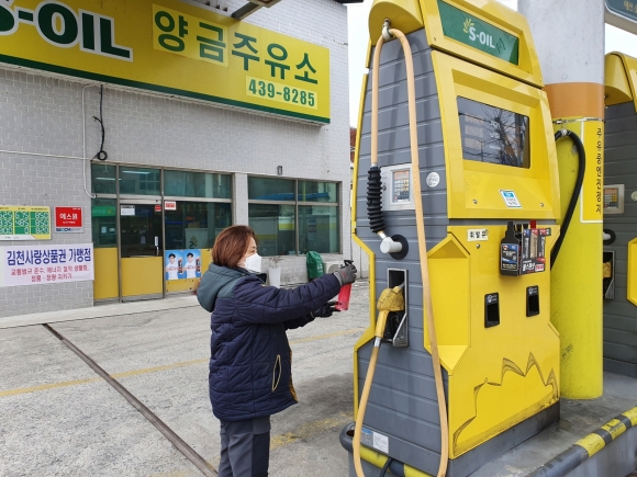 최근 인근 구미시, 대구시 등 지역으로 출퇴근 하는 유동인구로 대면접촉이 특히 우려되는 주유(충전)소 종사자들에게 마스크와 소독약품을 배부하고 자발적인 소독활동 강화로 안전한 주유시설물 만들기에 앞장서도록 독려했다. 김천시주유소협회(협회장 김기옥)에서는 “우리시 주유시설물에 대한 소독을 그 어느 때 보다 강화하고 있어 안심지역으로서 만들고 있다”고 강조하고 종사자들의 위생의식을 강화, 위생용품비치, 주유소이용협조문 부착, 비상연락망을 정비했다고 밝혔다.