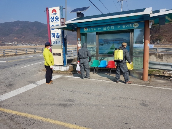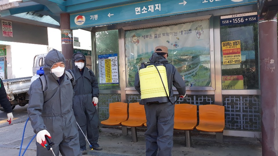 | 감천면 발전협의회(회장 김종화)회원들이 3월 2일 코로나-19 바이러스 지역 확산 예방을 위하여 관내 버스승강장에 대하여 소독 작업을 실시하였다