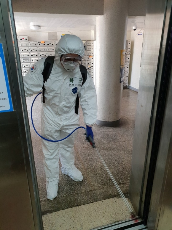 | 예비군대곡동대(동대장 임남기)는 2일부터 3일까지, 이틀 동안 코로나19 확산방지에 기여하고자 대곡동 관내 모든 아파트의 출입구과 엘리베이터, 우편함 등 불특정 다수의 손이 닿는 부분을 소독하는 집중방역 작업을 실시하였다.
