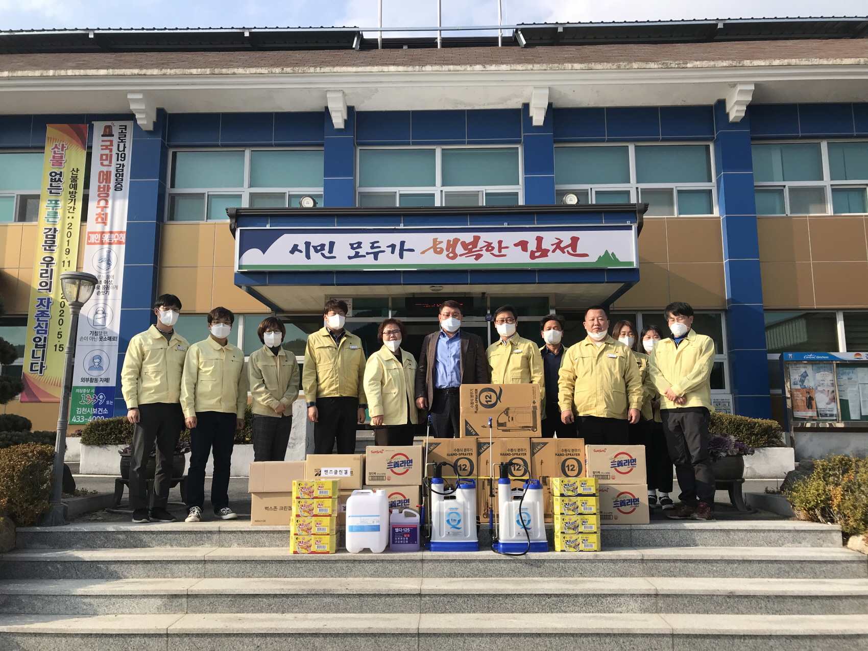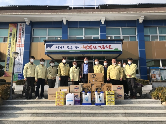 | 최근 코로나19가 대구 경북은 물론 김천에까지 확산되자 감문면 관내 기업인 일신콘크리드에서 라면, 손소독제, 소독약 등 방역물품(100만원 상당)을 전달했다.