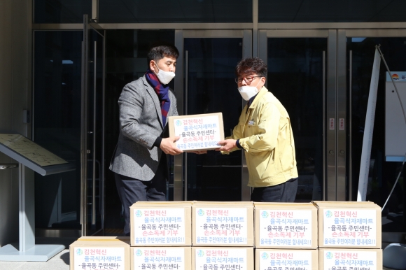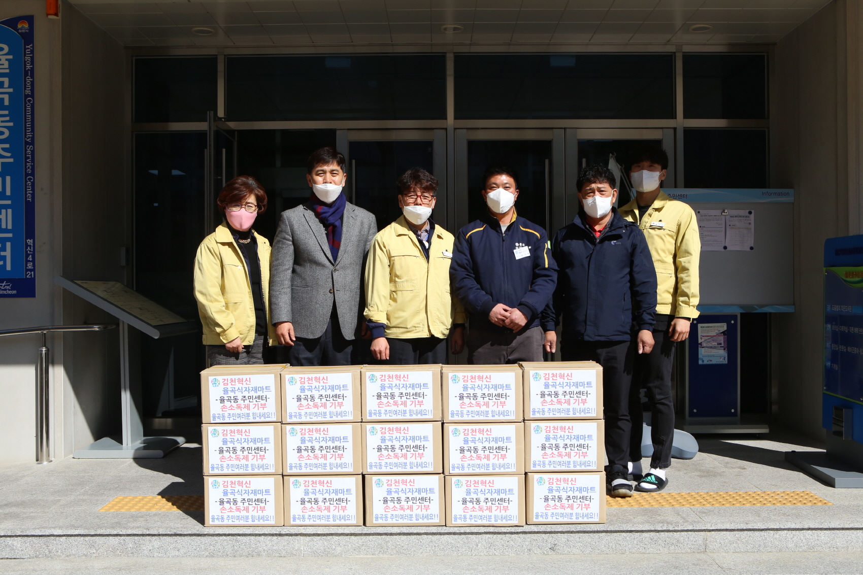 율곡식자재마트 신상우 대표는 “지난 2.29일 김천 7번 확진자가 발생되면서 이동경로에 포함되어 긴급방역소독 작업을 한 후 24시간 동안 임시 폐업을 하여 힘든 상황이지만, 코로나19 사태 극복과 예방활동을 위해 노력하고 있는 율곡동주민센터 직원들에게 조금이나마 도움을 주기위해 손소독제를 기탁하게 됐다.”고 말했다.