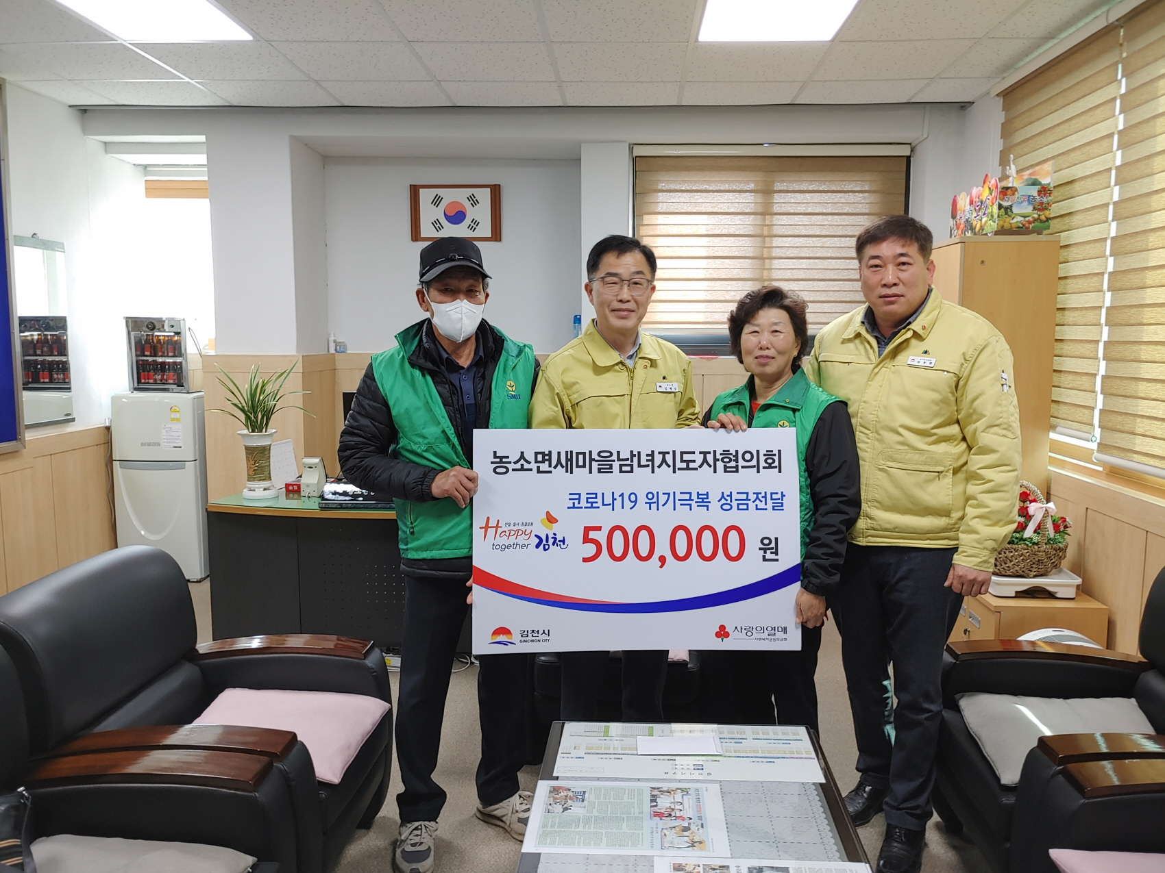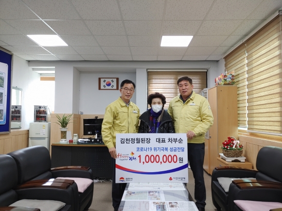 | 농소면 새마을남녀지도자협의회와 차부순 김천정월된장 대표가 신종 코로나19의 확산방지 및 피해최소화를 위해 지난 9일 농소면사무소를 방문하여 성금을 기탁하였다.