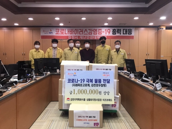 | 김천지역특화식품 상품화지원 사업장인 이즈브레드(덕곡동 소재)는 코로나바이러스감염증 19 극복을 위해 김천시에 시가 100만원 상당의 지례흑돈고로케와 김천호두 찰빵 100박스 빵을 기부했다.