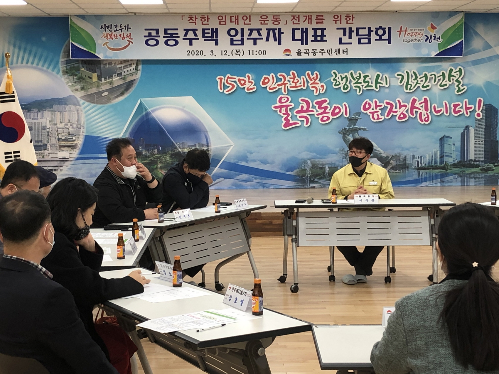 | 김천시 율곡동(동장 이우문)은 3월 12일 11시에 주민센터 2층 회의실에서 관내 공동주택(아파트) 입주자 대표들과 긴급하게 간담회를 가졌다. 이번 간담회는 코로나19 확산에 따른 착한 임대료 운동 홍보 및 공동주택 방역상황을 점검하기 위해 율곡동 13개 아파트 입주자 대표자들과 통장협의회장, 상인회장이 참석했다.