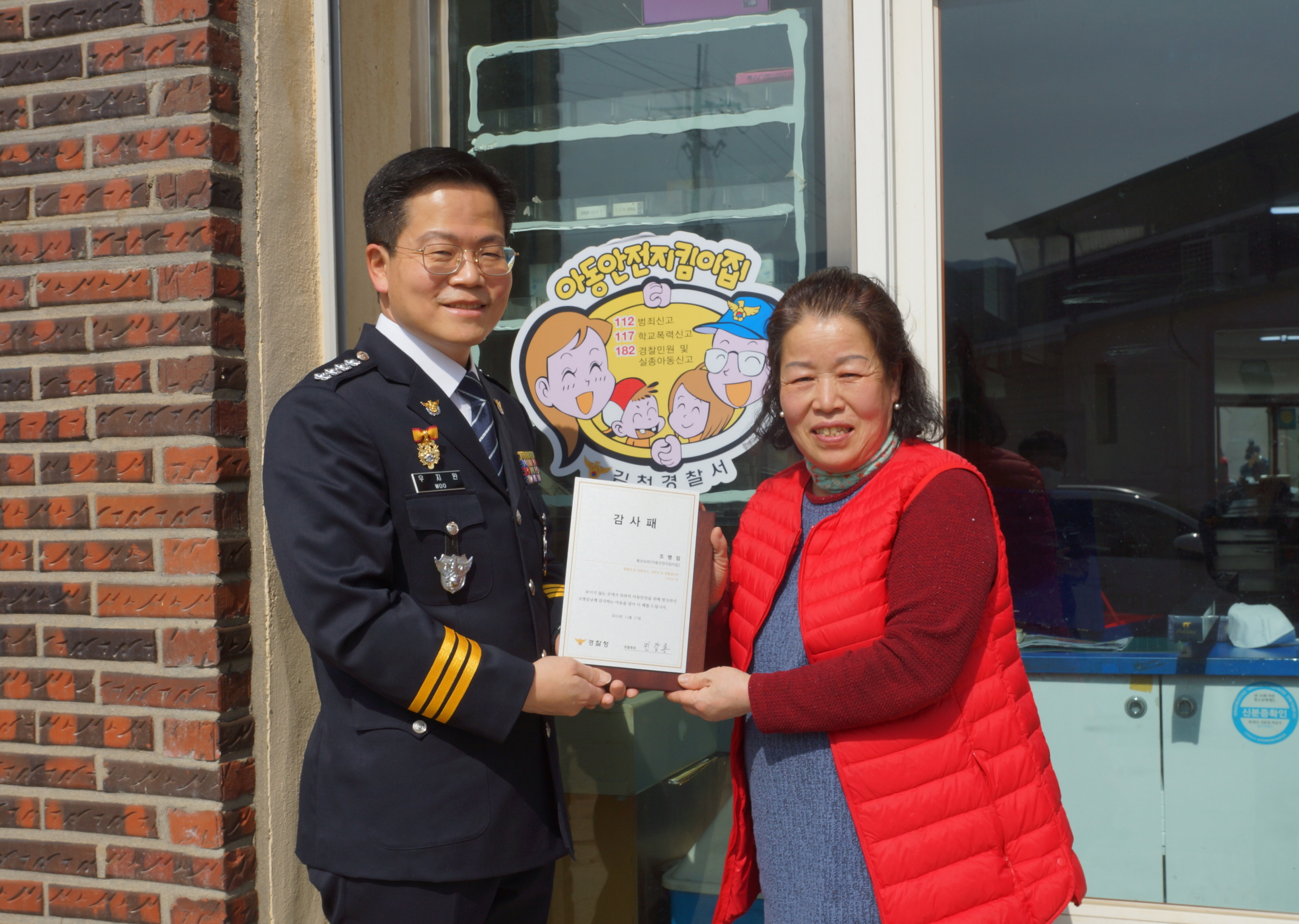 | 김천경찰서(서장 우지완)에서는 3월 13일, 2019년 하반기 우수활동 아동안전지킴이집인 김천시 봉산면 ○○슈퍼 운영자(A씨)에게 경찰청장 감사패를 전달하였다.
