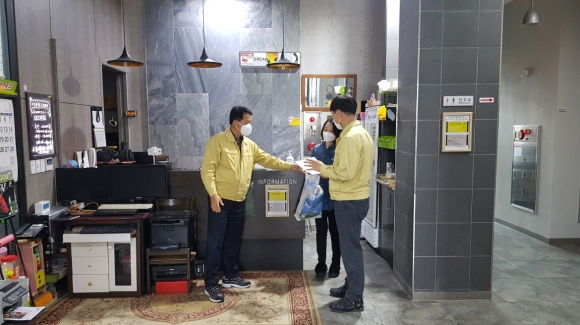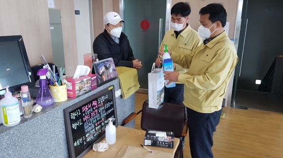 | 김천시(시장 김충섭)는 코로나19 감염병 지역사회 확산 예방을 위해 관내 신고체육시설업 110개소에 방문하여 기구와 출입문 등 공용부분을 소독할 수 있는 소독제 및 손소독제를 배부하였다.