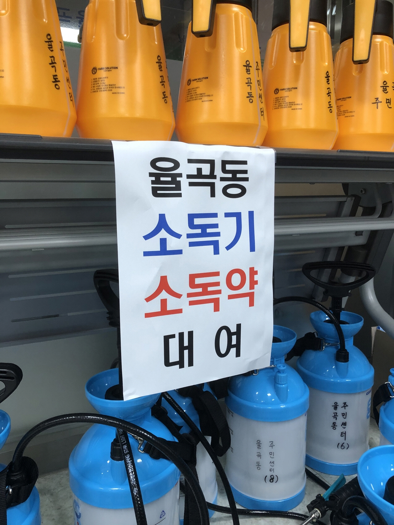 한편, 율곡동은 2월 29일부터 분무기와 소독약 무상 대여 사업을 시작하였으며, 현재까지 325명의 주민이 이용했다. 율곡동 관계자는 살균소독약품 사용시 마스크와 장갑을 착용하고, 인체, 음식, 동·식물에는 절대 분사하지 말고, 소독 후에는 충분히 환기를 시켜줄 것을 당부했다.