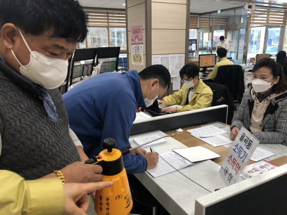 권영재 천년나무4단지 관리소장은 “율곡동주민센터의 코로나19 대응 방법이 나날이 진화하고 있다”며 “많은 입주민들이 개인소독을 꼼꼼히 할 수 있도록 방송 홍보를 하겠다”고 감사함을 전했다. 이우문 율곡동장은 “우리지역에서 코로나19가 진정국면에 들어섰다고는 하나 이럴때일수록 더욱더 개인방역과 위생에 방심하면 안된다”며 “상가주나 주택 및 오피스텔 입주자는 기존 그대로 율곡동주민센터에서 받아가시면 된다”고 말했다.