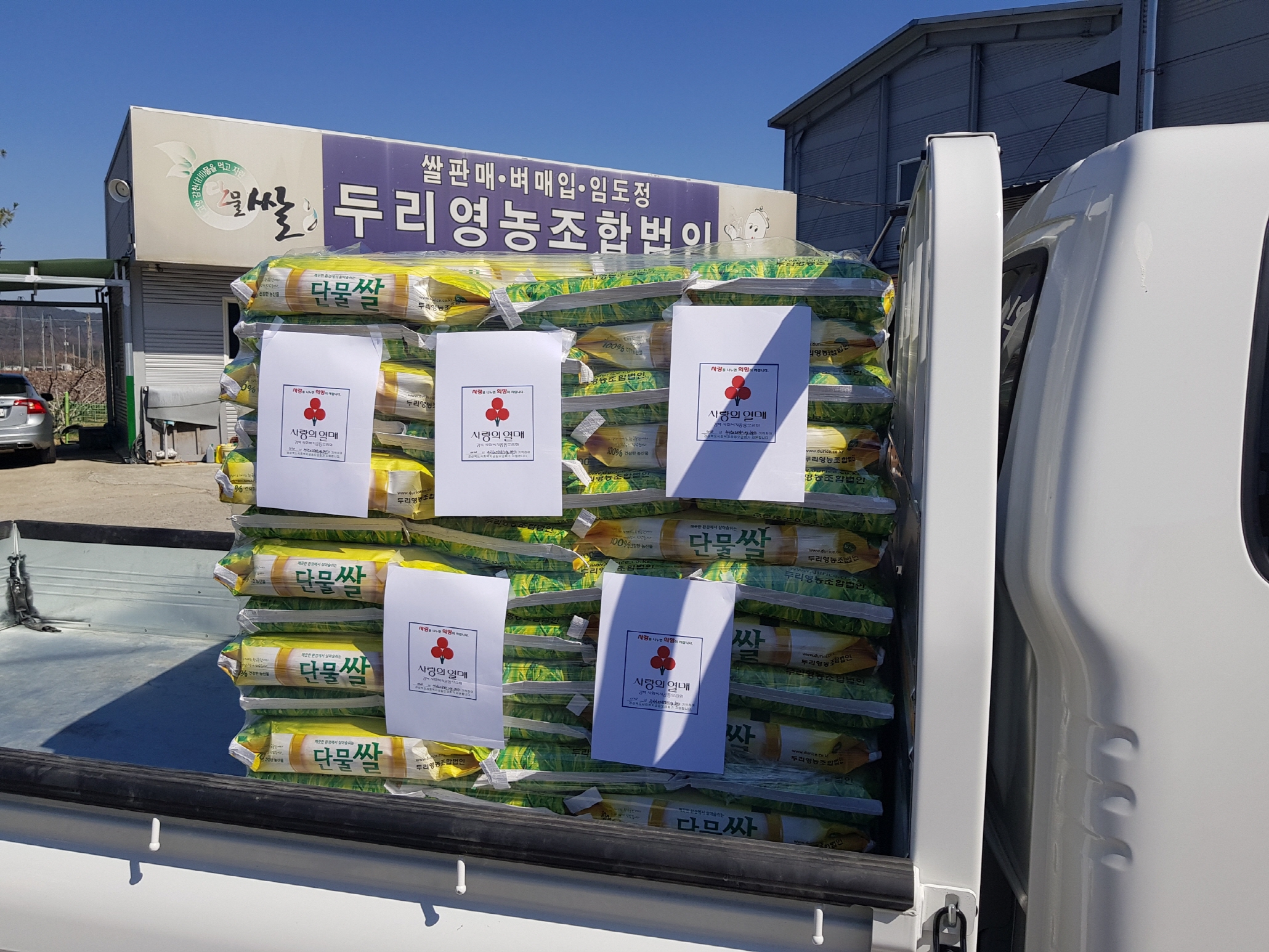 | 두리영농조합법인 (대표 김부신)에서 지난 18일 김천시청을 방문 코로나19로 어려움을 겪고 있는 관내 아동·청소년시설 등에 전달해 달라며 300만원 상당의 쌀(10kg) 100포을 전달하였다.