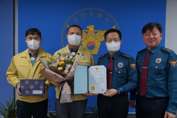 | 김천경찰서(서장 우지완)는 지난 20일 공동체치안활동의 일환으로 112출동 신속·정확화에 도움을 준 김천시청 도로철도과 도로조명팀 하승진(공업주사보)에게 경찰서장 감사장을 수여했다.