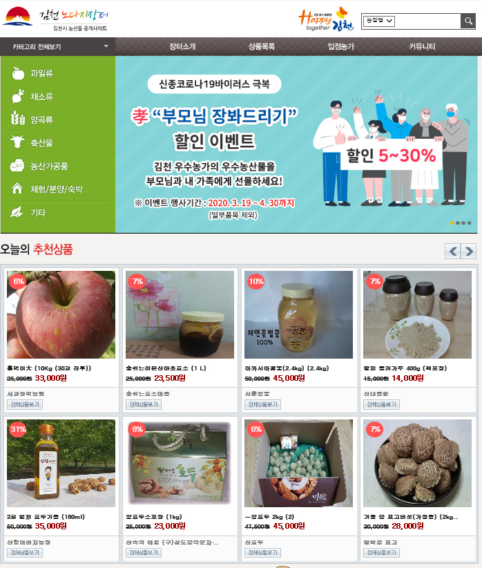| 김천시(김충섭 시장)는 코로나19 여파로 비대면 온라인 쇼핑 증가 추세에 발맞춰‘김천 노다지장터 쇼핑몰’을 통해 지역 우수 농특산물을 할인 판매하는 ‘코로나 19 대응, 孝道 온라인 특판 행사’를 4월말까지 진행한다. 이번 행사는 온라인으로 부모님 대신 장을 보거나 선물을 보내드림으로써 전염병 확산 방지를 위한 사회적 거리두기 분위기에 부모님을 챙겨드리지 못해 걱정하는 자녀들의 마음을 전하고, 지역 농가에도 도움을 주고자 기획했다.