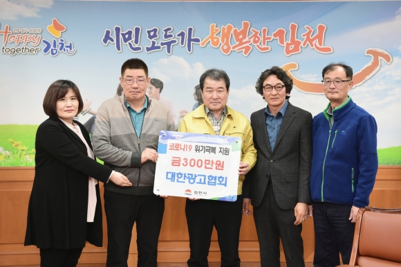 | 김천시 대한광고협회(회장 문장훈)에서 지난 23일 김천시청을 방문해 코로나-19 극복 성금 300만원을 전달했다. 김천시 대한광고협회는 코로나-19로 어려움을 겪고 있는 이웃을 위해 성금을 전달하였으며, 성금은 우리시 이웃들에게 따뜻한 마음을 담아 전달될 예정이다. 문장훈 대한광고협회장은 “코로나-19로 인해 광고업계도 어려움을 겪고 있지만 조금이나마 보탬이 되고자 광고협회에서 뜻을 모아 나눔을 실천하게 됐다.”면서“우리의 작은 성의가 코로나-19로 인해 어려움을 격고 있는 이웃들에게 작은 힘과 용기를 주었으면 좋겠다.”고 밝혔다.