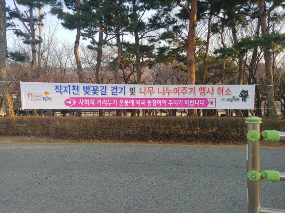 | 김천시는 코로나19 확산 방지를 위해 지난 21일 정세균 국무총리의 ‘사회적 거리두기 강화’를 위한 대국민 담화시 “훨씬 더 강력한 사회적 거리두기가 필요하다.”는 정부 정책에 따라 직지천 벚꽃길 걷기 및 나무 나누어주기 행사를 모두 취소하기로 결정했다.