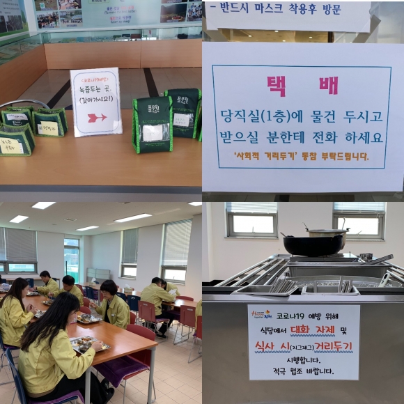 직원들은 구내식당 출입 시 마스크 착용, 손소독제 사용, 식사 중 대화자제 및‘지그재그식’착석, 그리고 2교대 식사로 직원 간 밀접촉을 최소화하고 있다. 뿐만 아니라 최근 코로나19가 장기화 되고 있는 가운데 경제적으로 직격탄을 맞은 전통시장과 소상공인들에게 도움이 될 수 있도록 매주 수요일은 외부 식당을 이용하고 있다. 택배와 녹즙 배달 또한 별도의 공간을 만들어 비대면 전달을 시행하고 있다.