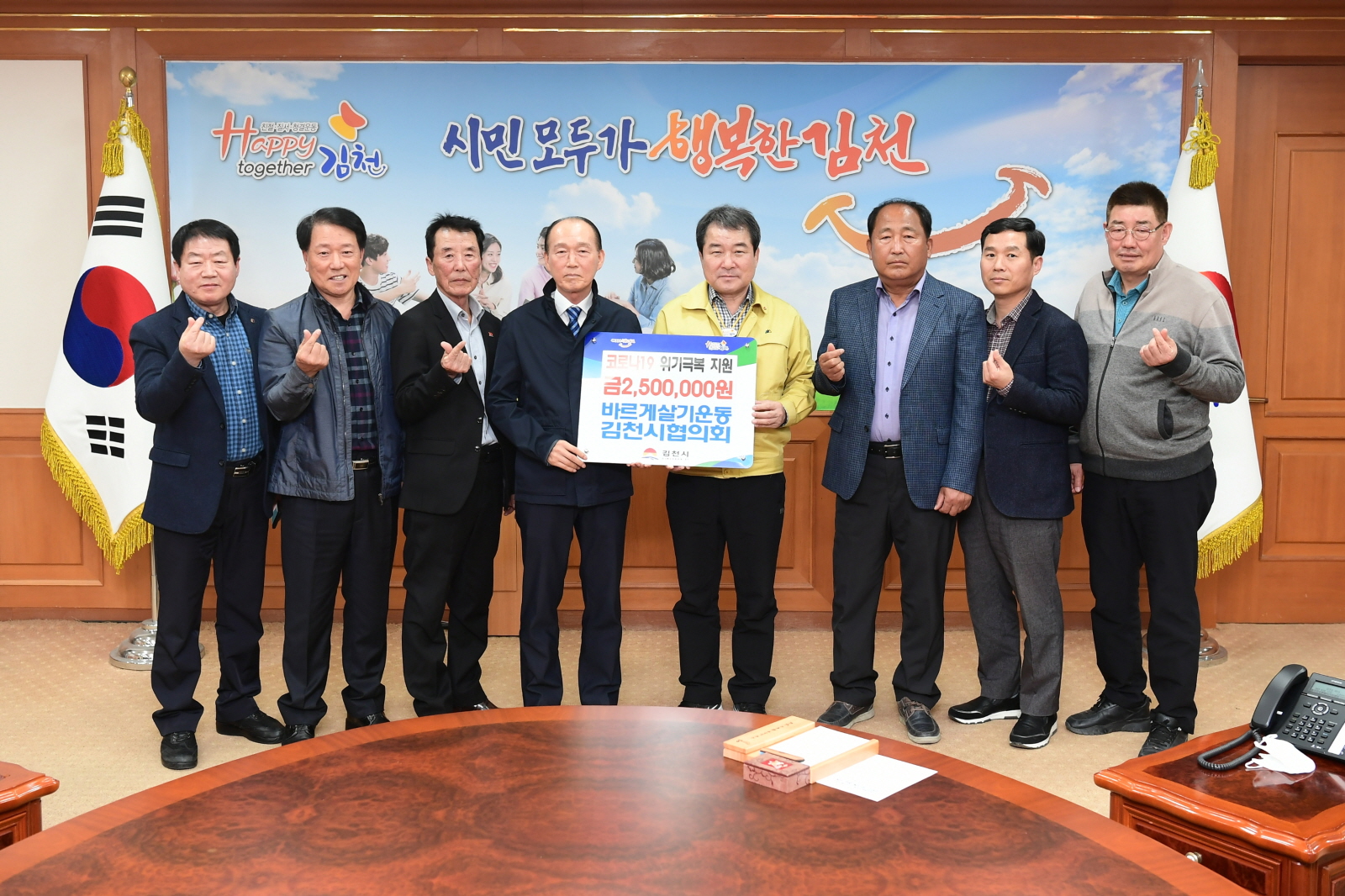 | 바르게살기운동 김천시협의회(회장 홍순용)은 지난 23일 김천시청을 방문하여 코로나-19 피해 극복에 보태달라며 성금 250만원을 전달하였다.