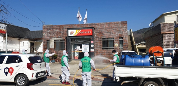 | 특히 각 마을별로는 매주 수요일을 방역의 날로 정하여 담당공무원과 이장들이 면에서 배부한 소독약으로 경로당, 정자, 마을창고 등 취약지에 방역소독을 하고 있다 또한 코로나-19 바이러스의 지역유입과 전파 가능성을 차단하기 위하여 민원인들에게 마스크 착용과 손소독제 사용을 반드시 하도록 하고 있으며 면사무소를 비롯한 파출소, 보건지소 등 구내식당 점심 식사 시에는 직원들이 3개조로 나눠서 하고 마주보기 식사를 금지하고 대화를 자제하는 등 감염병 예방에 철저를 기하고 있다.