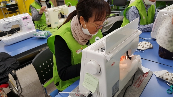 이날 자연보호협의회 회원 10여명은 녹색미래과학관 무한상상실에 모여 마스크 원단에 한땀 한땀 박음질을 하며 마스크 제작에 들어갔다. 미싱봉사가 가능한 회원들이 주축이 되었고, 미싱기계를 집에서 직접 가져온 회원도 3명이나 됐다.