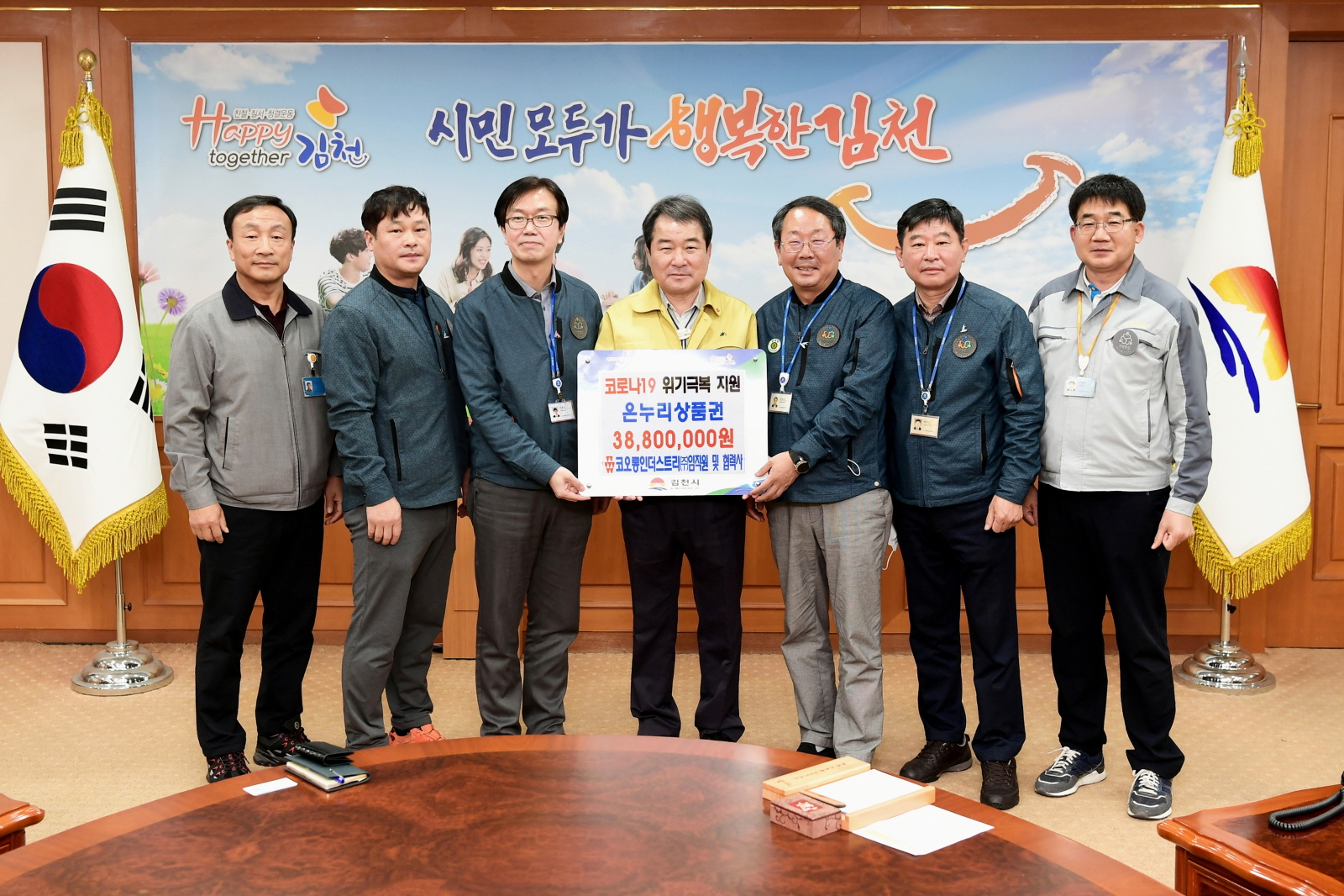 코오롱인더스트리(주)에서는 매년 지급하는 창립기념일 선물을 올해는 코로나19 사태로 어려움을 겪고 있는 지역 소상공인을 지원하기 위해 약 10억원 규모의 온누리 상품권을 임직원들에게 지급하였다. 이후 전국 사업장에 기부함을 설치하고 직원들의 자발적인 참여를 통해 상품권을 기부 받은 결과, 구미, 경산, 김천에서 총 1억2천만원 상당의 상품권이 모아졌고, 이 중 김천공장에서 모아진 38,800,000원의 상품권을 김천시에 기부하게 되었다.